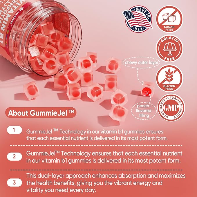 - Liquid-Filled Technology: LILICARE Vitamin B1 Gummies are crafted with advanced GUMMIEJEL technology for superior absorption. The innovative inner Liquid-filled layer locks in water-soluble vitamins like Vitamin B1 HCL, while the protective pectin stabilizes and preserves their efficacy. This dynamic dual-layer approach ensures your body receives the full benefits of the B Vitamin complex—quickly and effectively. Thiamine Gummies Peach Flavor helps both men and women feel their best, every day.