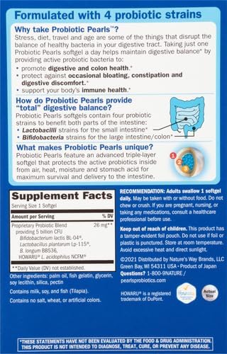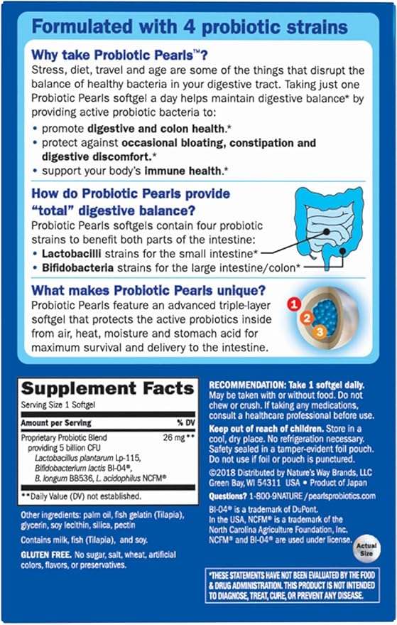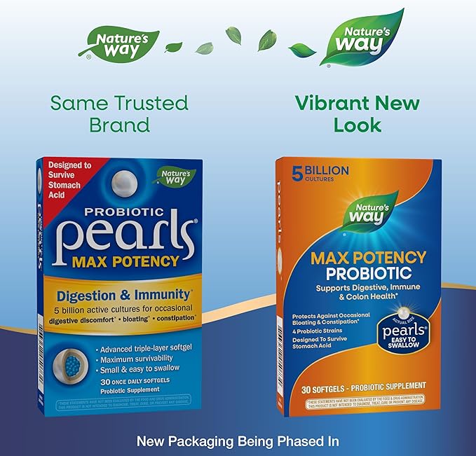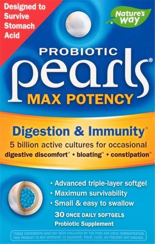 - Nature's Way Max Potency Probiotic Pearls contains 4 strains and 5 billion cultures in a convenient, once-daily softgel that's small and easy to swallow. This daily probiotic formula supports digestive, immune, and colon health.*