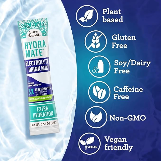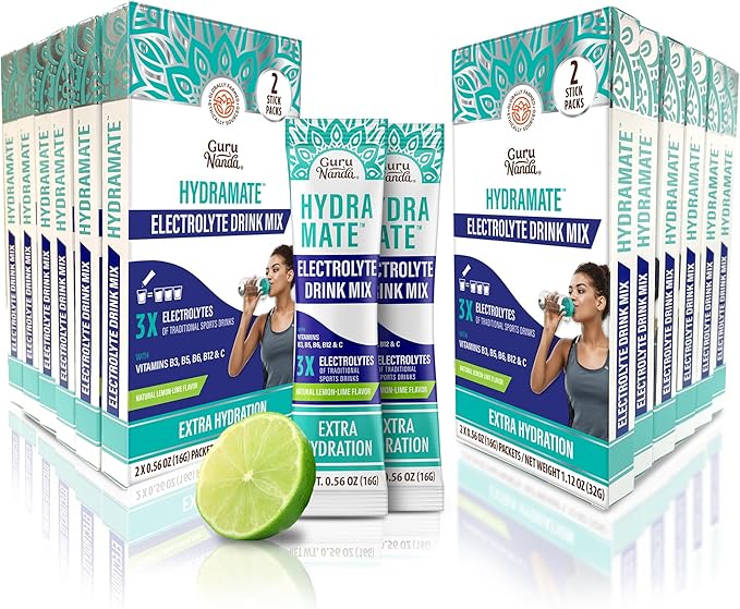 GuruNanda Hydramate Hydration Support Drink Mix - Electrolyte Powder Packets for Dehydration, Exercise & Energy - No Added Sweeteners, Non-GMO, Natural Lemon Lime Flavor - 24 Count (0.56 oz Each)