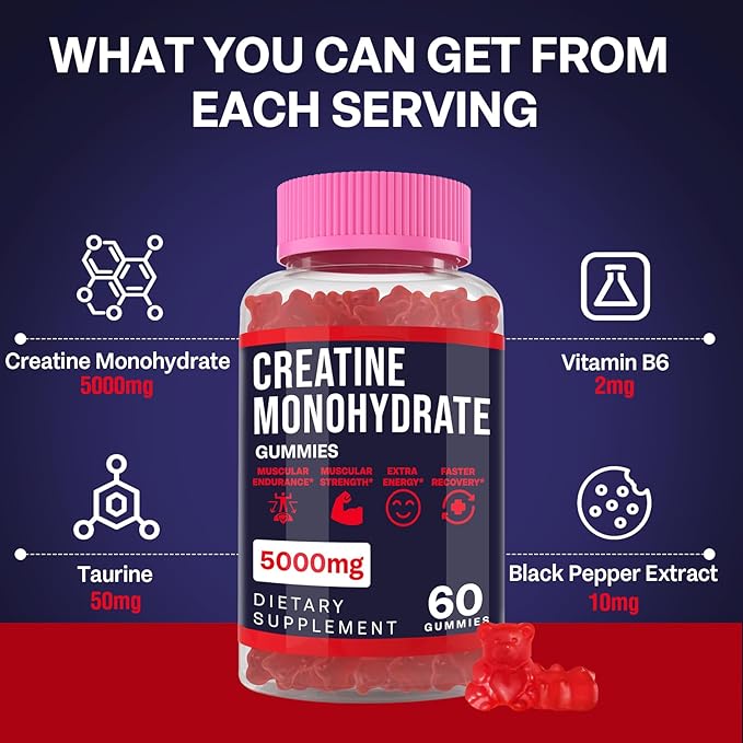 - High Potency & Absorption: Each serving of our Creatine Monohydrate Gummies provides a whopping 5000mg of Creatine Monohydrate for faster absorption. Enhanced with Organic Black Pepper Extract, our creatine monohydrate gummies ensure optimal bioavailability, offering you more effective results and better exercise performance, great creatine for women and men
