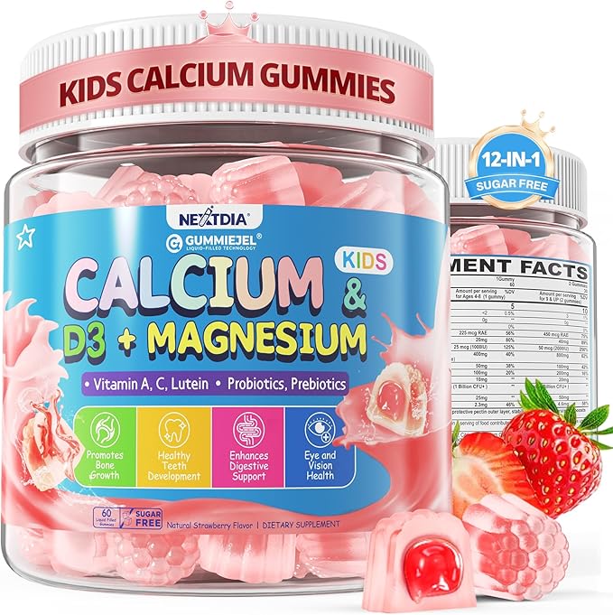 - đDelicious 3-IN-1 Kids Calcium Liquid-Filled Gummies: Using advanced GummieJel technology, we encapsulate essential minerals like calcium and magnesium in a nutrient solution, protecting them from oxidation and pH changes. With a tasty strawberry-flavored pectin outer layer, these gummies are not only delicious but packed with 3 types of calcium, magnesium, 3 vitamins, lutein, prebiotics, and probiotics. Perfect for supporting your child's bone health, immunity, vision, digestion, and teeth!