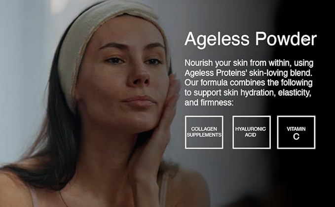 - SKIN REFRESH: Nourish your skin from within, using Ageless Proteins' skin-loving blend. Our formula combines collagen supplements, hyaluronic acid, and vitamin C to support skin hydration, elasticity, and firmness. These ingredients work synergistically to reduce the appearance of fine lines and wrinkles, promoting a more youthful complexion. Invest in your skin's vitality and radiance with a supplement that delivers beauty benefits alongside its fitness support.