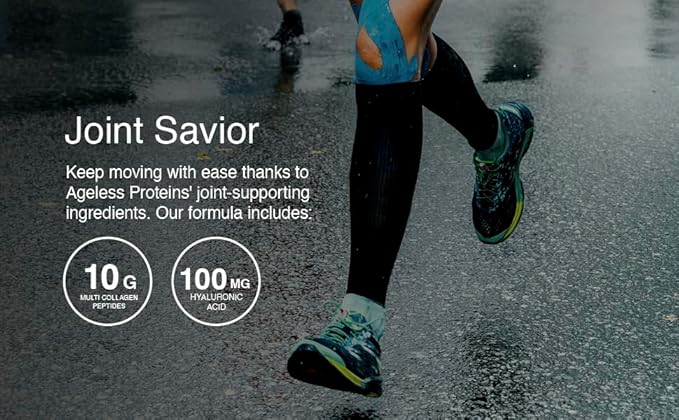 - JOINT SAVIOR: Keep moving with ease thanks to Ageless Proteins' joint-supporting ingredients. Our formula includes 10g of multi collagen peptides and 100mg of hyaluronic acid per serving, working together to lubricate joints, improve flexibility, and reduce discomfort. These key components support cartilage integrity and enhance overall joint function, helping you stay active and enjoy your favorite activities without limitations. Experience improved mobility and comfort with every scoop.