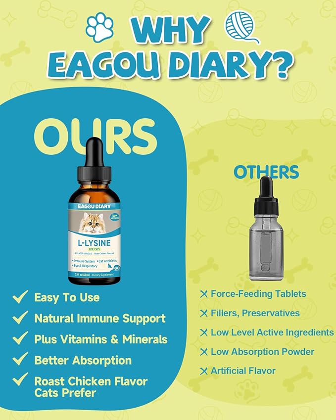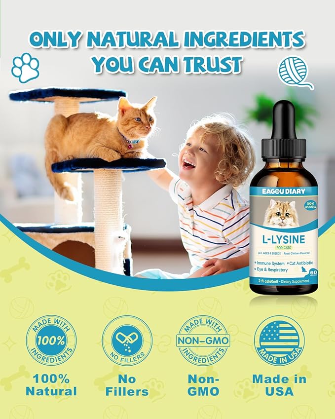 - L-Lysine Supplement for Cats: Featuring an advanced formula, our cat lysine drops are specifically designed to provide comprehensive health for your cat, supporting immune, allergies, sneezing, respiratory, and eye health