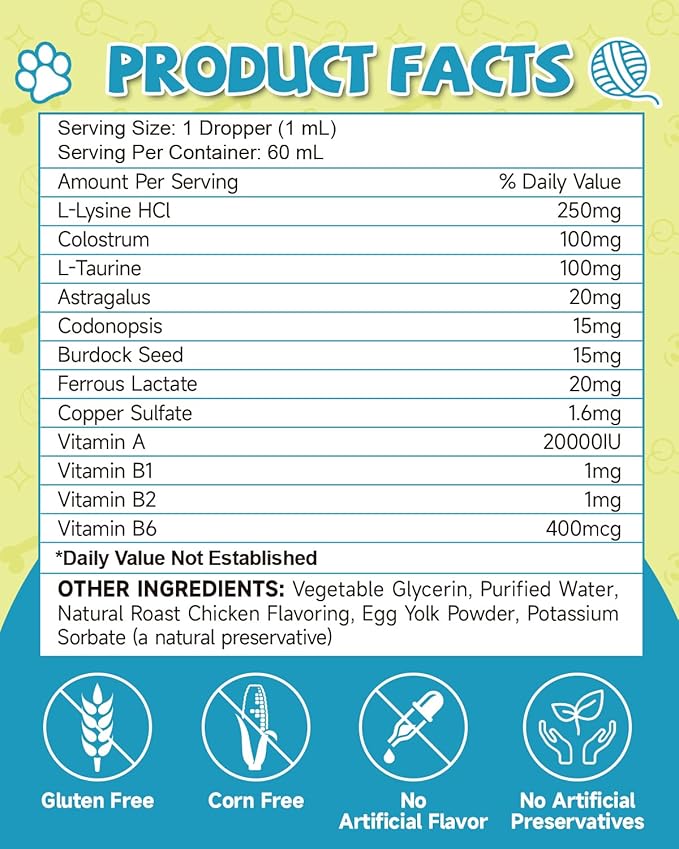 - Suitable for Kittens and Cats: Better suited to the health needs of kittens and cats of all ages, our L-Lysine drops for cats feature a roasted chicken flavor and are enriched with additional nutrients such as colostrum, vitamins, and minerals