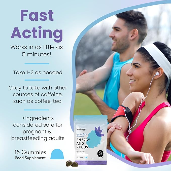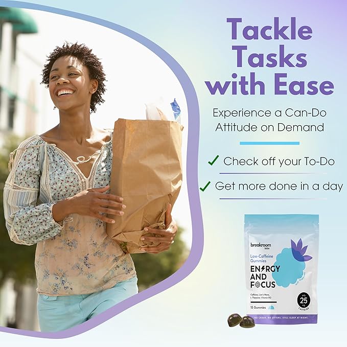 - Convenient and Portable: Our low-caffeine gummies are designed with your busy lifestyle in mind. Perfect on-the-go energy, these gummies easily fit in your purse, gym bag, or desk drawer. They're an ideal companion for professionals, runners, students, and travelers. Enjoy the benefits of energy and focus wherever you are, without the need for messy energy gels, preworkout powders or bulky energy drinks.