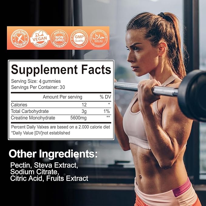 - [Creatine Monohydrate Gummies]:Creatine is one of the most effective, safe, and well-studied supplement to improve performance,increased muscle endurance,muscle growth or recovery. Just 4 gummies per serving to meet your daily 5.6g creatine requirement. Get ready to get bigger, stronger, and push beyond your limits — naturally.