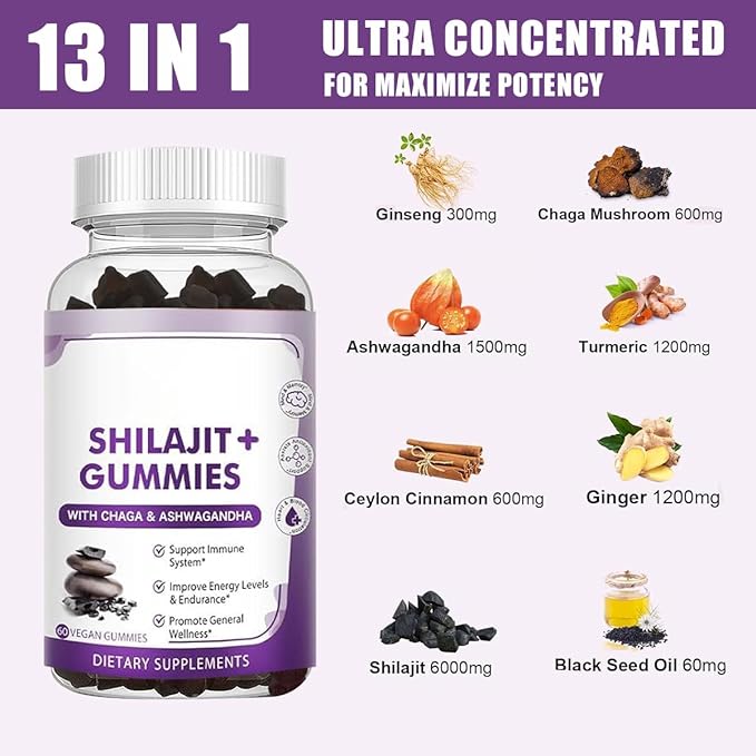 - POWERFUL 13-IN-1 FORMULA: Unleash your potential with our 13-in-1 powerful blend, featuring Shilajit, Ashwagandha, Chaga Mushroom, Ginseng, Ginger, Turmeric, and more. Provides essential nutrients like zinc, iron, and magnesium for comprehensive health support.