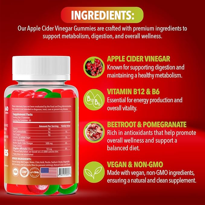 - Made with high-quality apple cider vinegar and enriched with vitamins B12 and B6, these vegan, non-GMO, and gluten-free gummies are designed to support wellness.