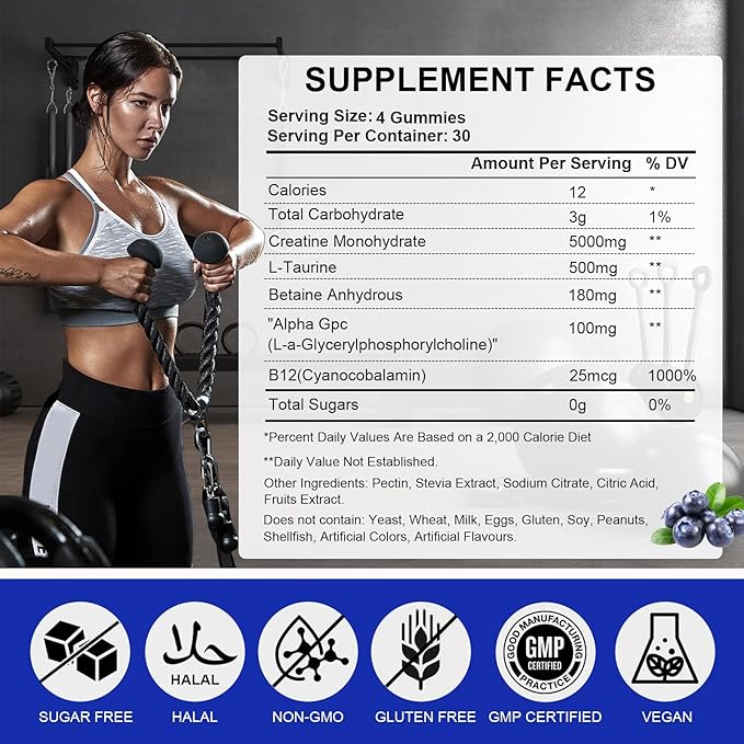 - Advanced Formula & Maximum Potency: Our creatine monohydrate gummies contain 5 grams of pure creatine monohydrate per serving, combined with L-Taurine, Vitamin B12, anhydrous Betaine, and Alpha GPC to maximize effectiveness. Our highly effective, professional formula gummies are designed specifically for both men and women, allowing you to feel the difference.