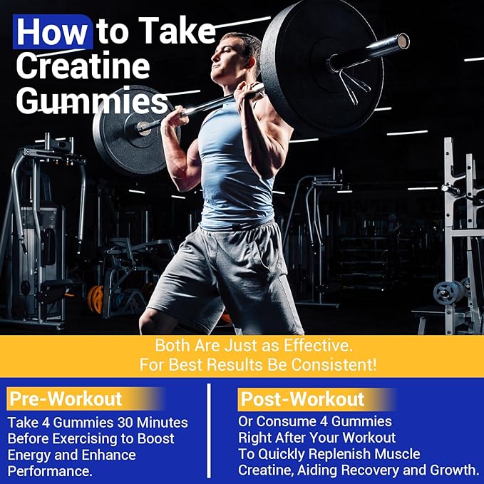 - Easy to Consume: Blueberry flavored creatine monohydrate gummies are an easy way to consume, 4 gummies per serving, you can take it at any time, any place. You'll have a 30-day supply at your fingertips, requiring just four gummies a day. Whether you're heading to the gym, the office, or traveling, you can enjoy the convenience and simplicity of our delicious, easy-to-carry supplements.