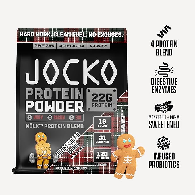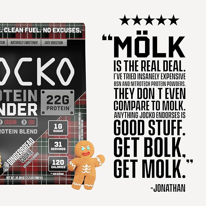 Jocko Mölk Whey Protein Powder - Keto, Probiotics, Grass Fed, Digestive Enzymes, Amino Acids, Sugar Free Monk Fruit Blend - Muscle Recovery & Growth (31 Servings (Pack of 1), Gingerbread Cookie)
