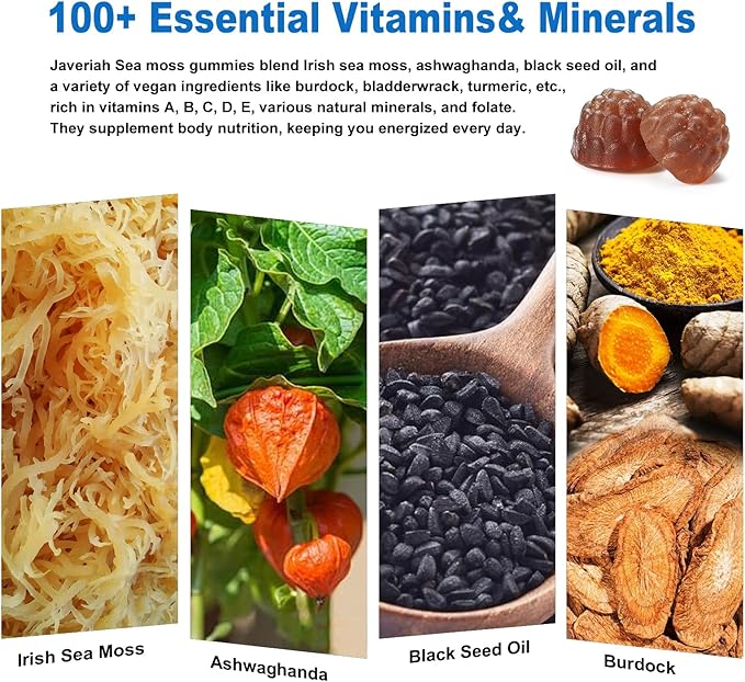 - 13 in 1 Superfood Gummies : Javeriah Sea moss gummies are packed with over 100 essential vitamins and minerals plus an immunity blend to increase nutrient absorption by 50%. Our 100% vegan superfood gummies are a perfect combination of natural ingredients including Irish Sea Moss,Black Seed Oil, Ashwagandha, etc. 13-in-1 sugar-free gummies are a healthier alternative to traditional gummies.