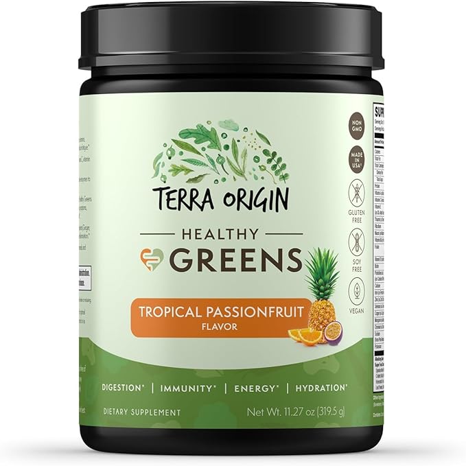 TERRA ORIGIN Healthy Greens Powder, Superfoods, Probiotics, Enzymes, Immune & Digestive Support, Energy & Wellness Boost, Gut Health, 30 Servings (1-Pack, Tropical Passionfruit)