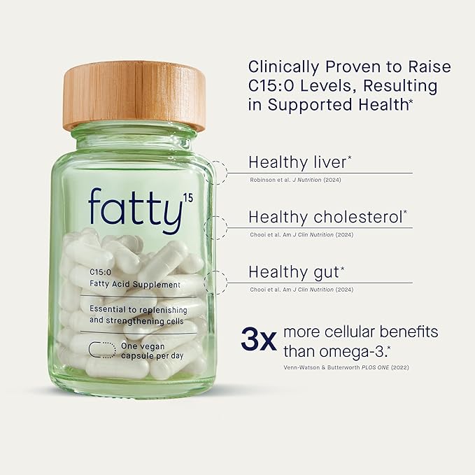- SUPPORTED GUT, LIVER AND CHOLESTEROL HEALTH: The pure C15:0 ingredient in fatty15 has been clinically proven to raise C15:0 levels, resulting in improved gut microbiome health, improved liver function and lowered liver enzymes, lower LDL cholesterol, and improved red blood cell health within 12 weeks. Clinical Study References: Robinson et al. J Nutrition 2024, Chooi et al. Am J Clin Nutrition 2024, Venn-Watson & Butterworth PLOS ONE 2022