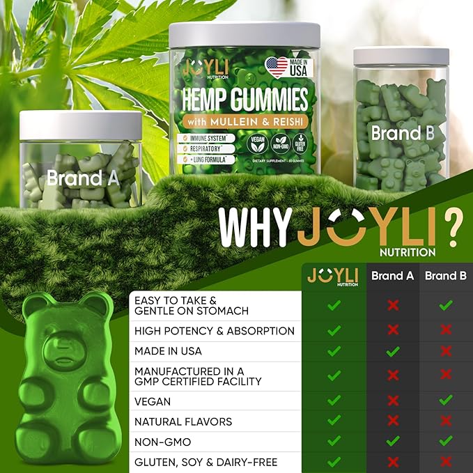 2 Pack - JOYLI Hemp Gummies for Lung Cleanse – Sugar-Free Vegan Gummies with Mullein Leaf, Reishi Mushroom, & Multivitamins – Natural Lung Support Supplement – 60 Gummies per Pack