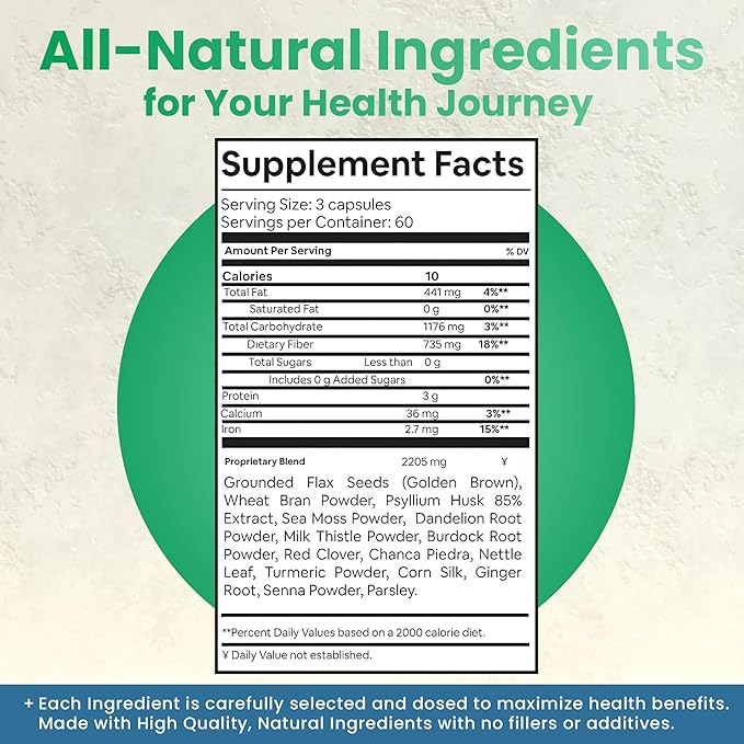 - Special Ingredients : Grounded Flax Seeds (Golden Brown), Wheat Bran Powder, Psyllium Husk 85% Extract, Sea Moss Powder, Dandelion Root Powder, Milk Thistle Powder, Burdock Root Powder, Red Clover, Chanca Piedra, Nettle Leaf, Cranberry Extract, Turmeric Powder, Corn Silk, Ginger Root, Senna Powder, Parsley Grounded Flax Seeds (Golden Brown), Wheat Bran Powder, Psyllium Husk 85% Extract, Sea Moss Powder, Dandelion Root Powder, Milk Thistle Powder, Burdock Root Powder,… See more