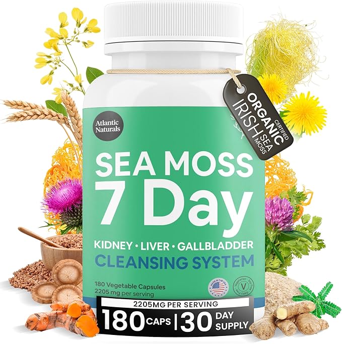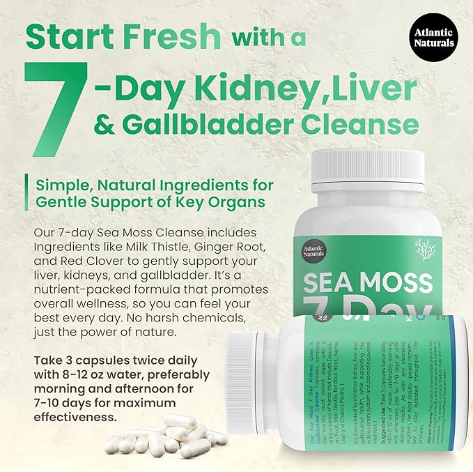Atlantic Naturals Sea Moss 7 Day Detox Liver, Gallbladder & Kidney Cleanse Capsules- Support with Dandelion Root, Milk Thistle, Burdock Root, Red Clover, Chanca Piedra - 180 Sea Moss Capsules