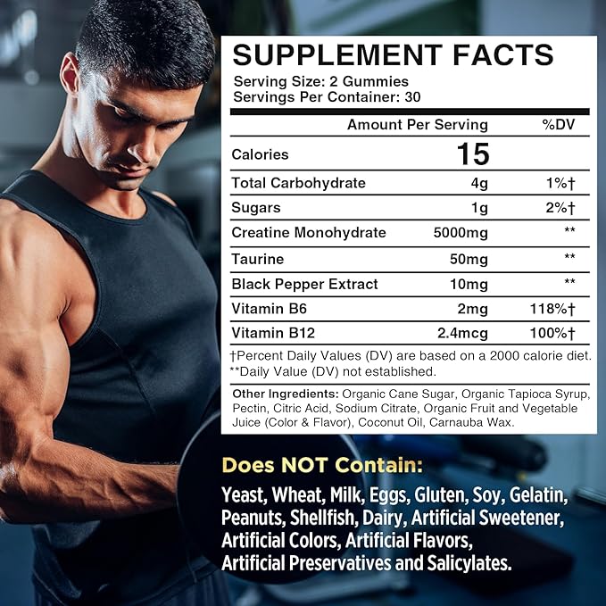 - Highly Effective Formulas: Our creatine monohydrate gummies feature black pepper extract to boost the bioavailability of other supplements. With Vitamin B12 and Taurine, they enhance energy levels and help you exercise longer