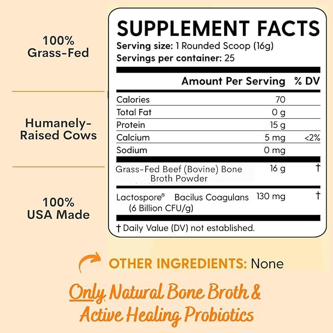 - MADE WITH CARE IN USA, FROM OUR FAMILY TO YOURS: Our slow-simmered natural bone broth is made in the USA, free from any additives, fillers, or artificial ingredients. Every scoop you take is packed with pure, natural healing goodness.