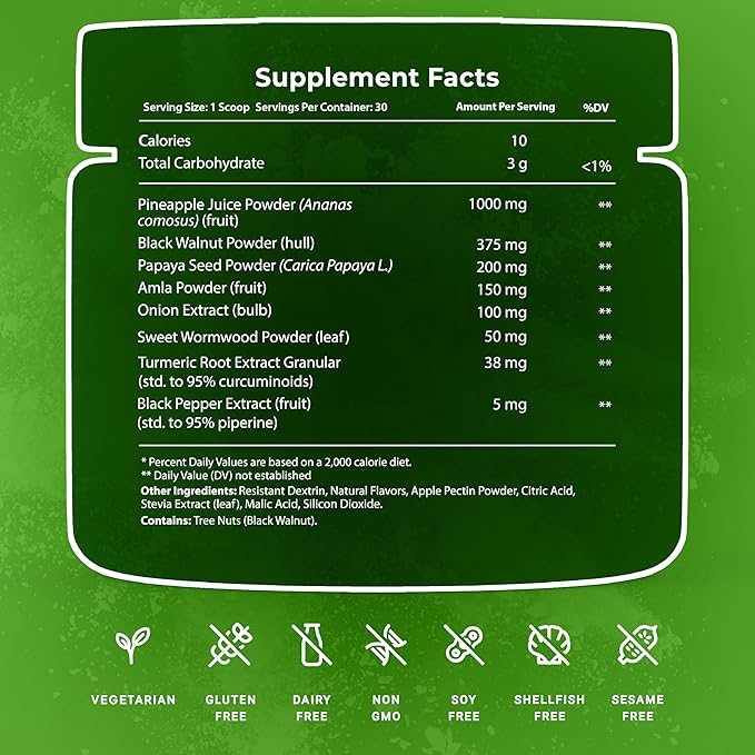 - Special Ingredients : Black Walnut Powder, Pineapple Juice Powder (Ananas comosus), Sweet Wormwood Powder, Turmeric Root Extract Granular, Black Pepper Extract , Papaya Seed Powder, Amla Powder, Onion Extract Black Walnut Powder, Pineapple Juice Powder (Ananas comosus), Sweet Wormwood Powder, Turmeric Root Extract Granular, Black Pepper Extract , Papaya Seed Powder, Aml… See more