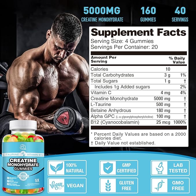 - PEAK PERFORMANCE & OPTIMAL MUSCLE SUPPORT - Our creatine monohydrate for women and men are infused with organic L-Taurine to accelerate absorption. Creatine pre-workout gummies allow you to train harder, recover faster, and gain the strength and endurance you have been striving for