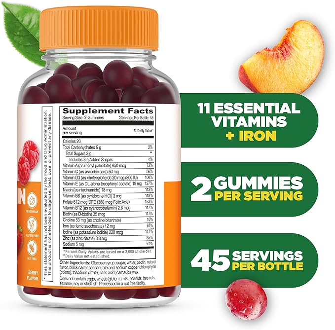 Lifeable Multivitamin with Iron for Adult | 13 Essential Vitamins and Minerals for Men and Women | Great Tasting Naturally Sourced Berry Flavor | Vegetarian Non-GMO | 90 Gummies