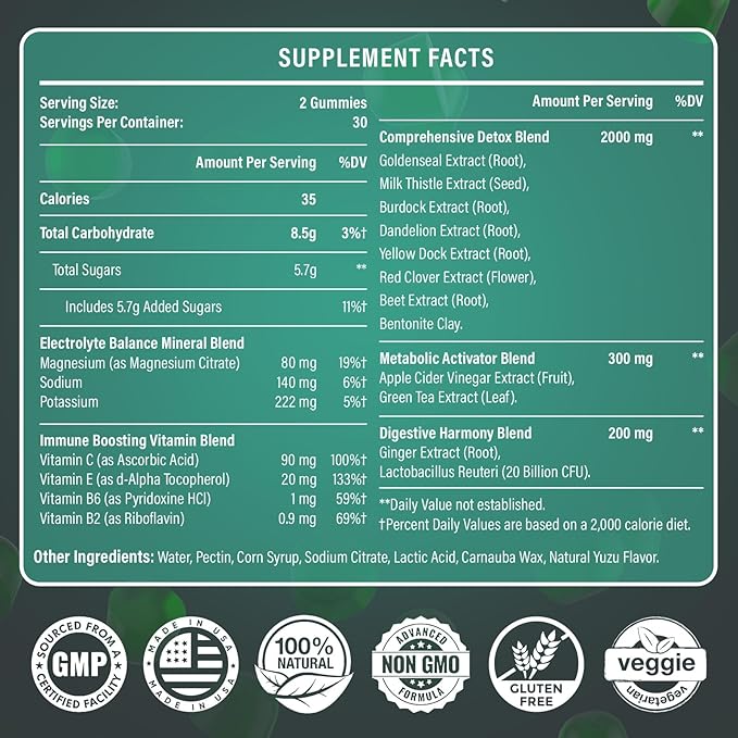 - Natural Ingredients for Effective Detox: Crafted with natural and high-quality ingredients, our liver cleanse detox gummies are designed to work synergistically, supporting the body’s natural detox processes; With potent minerals - Sodium, Potassium, and Magnesium that support better hydration and electrolyte balance, these gummies provide a safe, quick, and effective cleanse