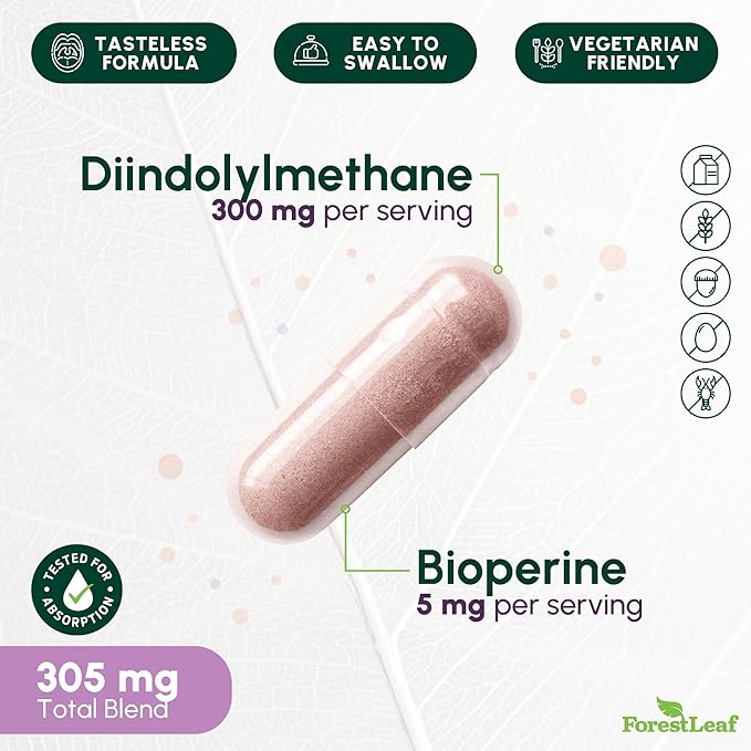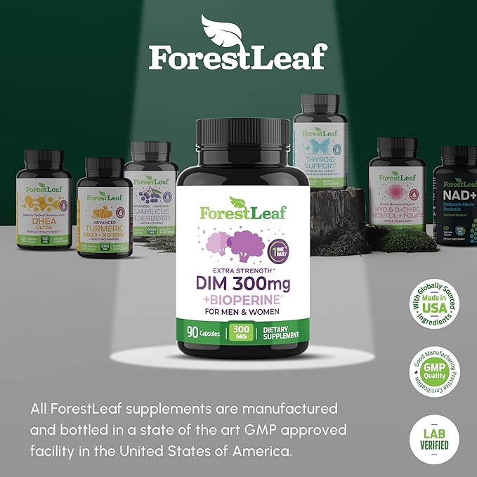 ForestLeaf DIM Supplement for Women & Men - DIM 300mg Per Capsule with BioPerine for Highest Absorption - Diindolylmethane for Metabolism Balance and Support, Detox, Menopause Relief (90 Capsules)